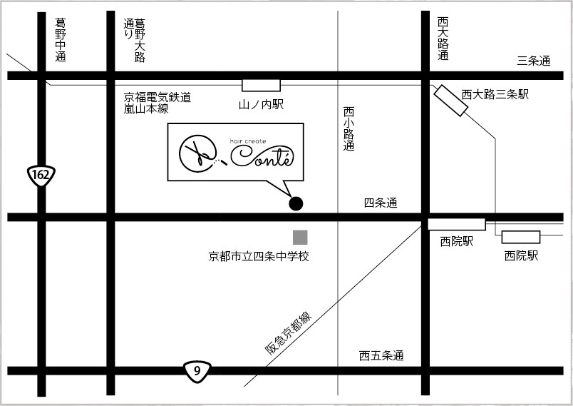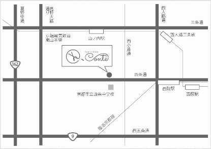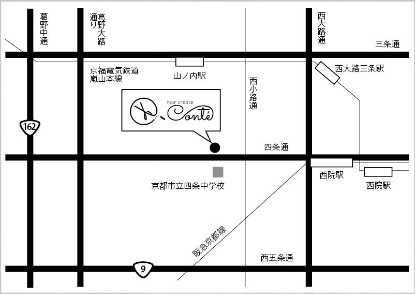 四条西小路交差点より西に100m、京都ファミリーより東へ200m。四条中学前バス停目の前。車でお越しのお客様近隣コインパーキングをご利用ください。